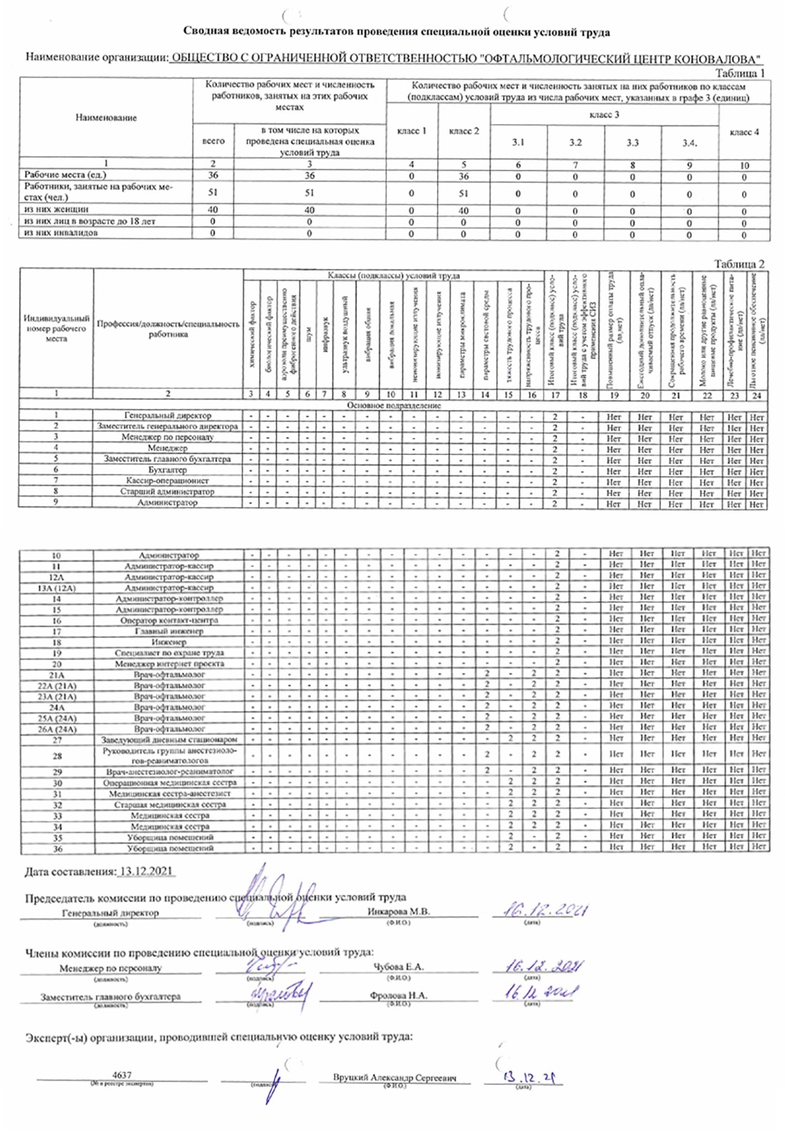 Сводная ведомость результатов проведения специальной оценки условий труда ООО "Офтальмологический центр Коновалова".