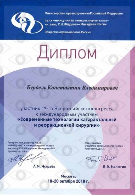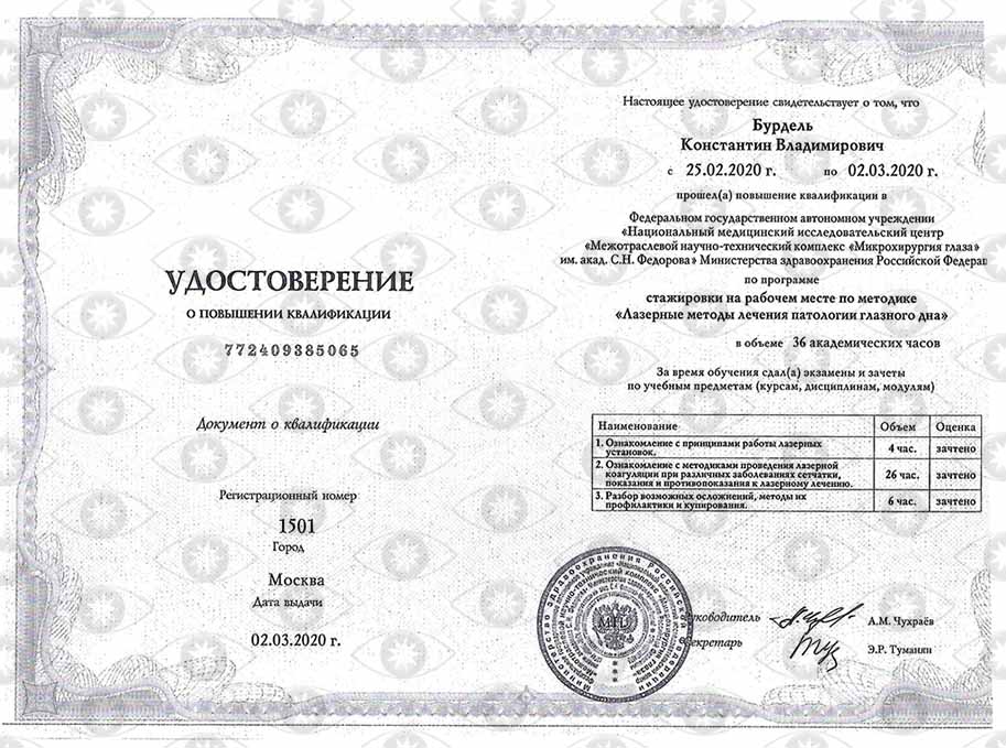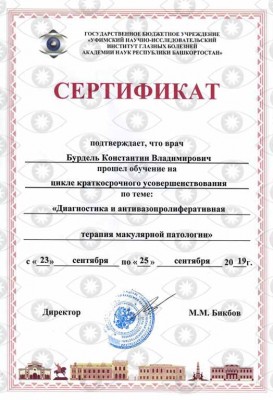 лазерный хирургВладеет современными методами диагностики и консервативного лечения, различными техниками лазерных микрохирургических вмешательств при патологии сетчатки, глаукоме. Специалист по катаракте и заднему отрезку глаза, хирургия катаракты, глаукомы, интравитреальное введение ингибиторов ангиогенеза, лазерное лечение патологии сетчатки. Циклоскопия (осмотр глазного дна), лазерное лечение (при патологии сетчатки, сахарном диабете, при посттравматических изменениях, вторичных катарактах, начальных формах глаукомы). Предоперационное и послеоперационное ведение пациентов после офтальмологических операций